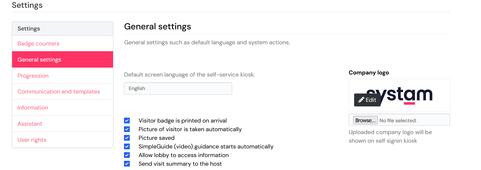 The company logo can be changed in the Systam Visit web service (RespaManager) by an admin user. Before adding the logo, please make sure the logo is in JPG-format. Other formats with transparent background are not shown correctly.