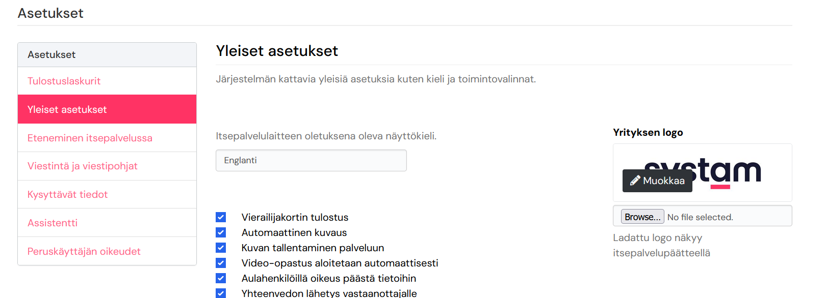 Itsepalvelupäätteillä näkyvän logon voi päivittää Systam Visit -webpalvelun (RespaManager) kautta pääkäyttäjätunnuksilla. Logon tulee olla JPG-muodossa. Muut muodot (esim. läpinäkyvä tausta) eivät näy oikein päätteillä.