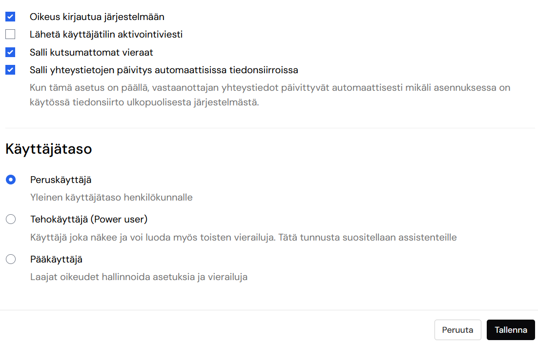 Aulakäyttäjän tunnuksia ei voi muokata tai luoda pääkäyttäjänä. Vain toinen aulakäyttäjä voi luoda ja muokata aulatunnuksia.