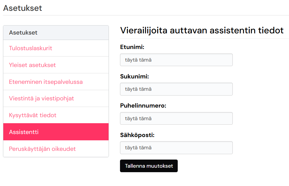 Assistenttitietoa voi muokata Systam Visit -webpalvelussa (RespaManager) pääkäyttäjä- tai aulakäyttäjätunnuksilla kohdasta Hallinta ja Asetukset.